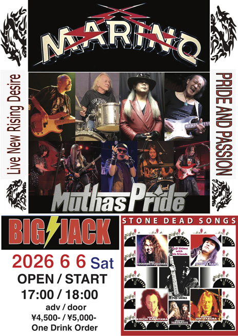 今回のイベントのテーマは、見応えのあるバンドをたっぷり楽しんでいただく事。 出演バンドを2バンドに絞り、両バンド共にほぼワンマンに近いライブ構成をお願いして、 たっぷり演奏していただく事にありました。 普段のライブ・イベントでは味わえない醍醐味を味わって頂けたと思います。 最初のAya Project登場から会場は一気に盛り上がり、イベント終了までダレる事のない、 あっという間の3時間半でした。我がMUTHAS PRIDEも本拠地でしっかりと演奏することが出来ました。 また第二弾!、第三弾!と企画したいと思います。 次回ライブは6月6日(土) 阿波座BIG JACK 《MUTHAS PRIDE Awaza Big Jack on February 7, 2026 set list》 |